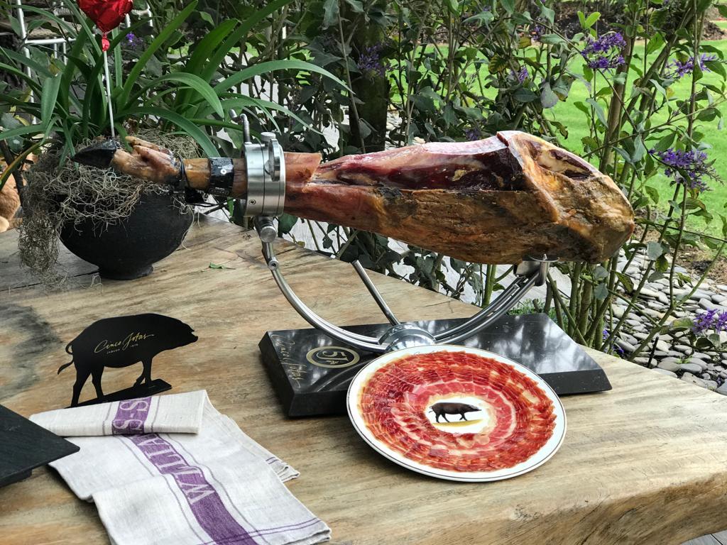DESDE 1879, Cinco Jotas elabora JAMONES 100% IBÉRICOS reconocidos mundialmente por su calidad incomparable. La empresa está ubicada en JABUGO (España, Huelva - Andalucía), LUGAR PRIVILEGIADO y verdadero TEMPLO del jamón ibérico. El nombre de la marca hace referencia a las 5 ESTRELLAS de los hoteles de LUJO lo cual en este caso se traduce con 5 jotas por la"J "de Jamón.