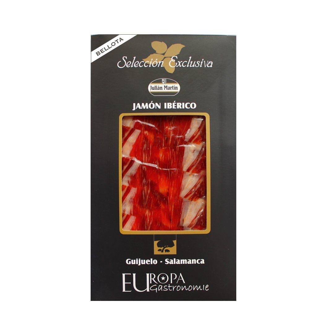 JAMÓN DE BELLOTA -- Marca JULIAN MARTIN -- cortado artesanalmente a cuchillo y empacado al vacío en CAJA de LUJO, contiene un TOTAL de 80g.
